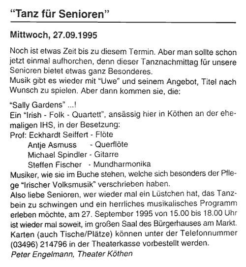 Anzeige in der MZ vom September 1995: Peter Engelmann, Chef des Köthener Theaters, lädt zum »Tanz für Senioren« in das Bürgerhaus am Markt ein
