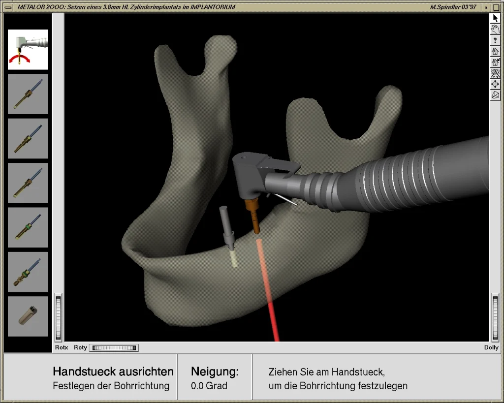 Die Ausbildung von Zahnärzten auf dem zu dieser Zeit noch recht jungen Gebiet beschränkte sich meist auf ziemlich blutige Lehrvideos (in schwarz/weiß war es erträglicher…). Mit den im Studium erworbenen Kenntnissen und Techniken erstellten wir ästhetisch ansprechende Anwendungen mit Macromedia Director (2D) sowie Alias (3D-Modelling) und SGI Inventor (3D-Interaktion), die wir unter anderem auf der Internationalen Dentalmesse »IDS« in Köln präsentierten.